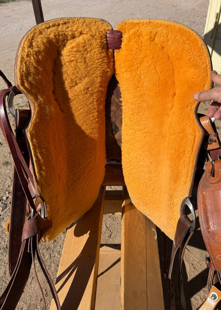 Roughout hard seat with rawhide pencil roll cantle binding.